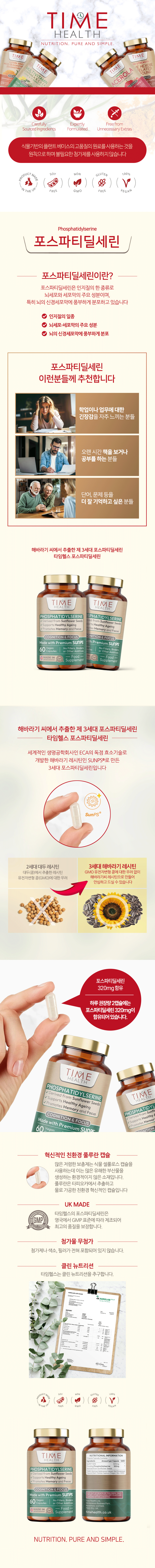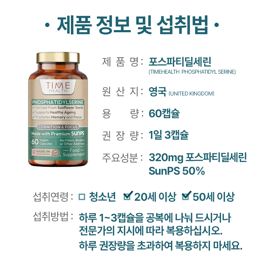 영국의 프리미엄 건강기능식품 회사인 타임헬스의 포스파티딜세린 입니다. 세계적인 생명공학회사인 ECA의 독점 효소기술로 개발한 SUNPS®로 만든 3세대 포스파티딜세린은 GMO에 대한 우려없이 섭취하실 수 있습니다.